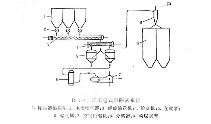 圖1—4是常用的正壓倉式泵除灰系統(tǒng),在此系統(tǒng)中,從干式除塵器分離下的灰,經(jīng)電動(dòng)鎖氣器、螺旋輸送機(jī)和給灰機(jī)進(jìn)入倉式泵、用壓縮空氣將灰吹送。
